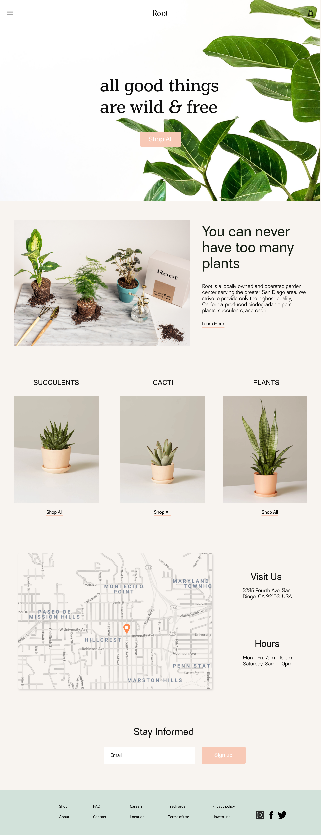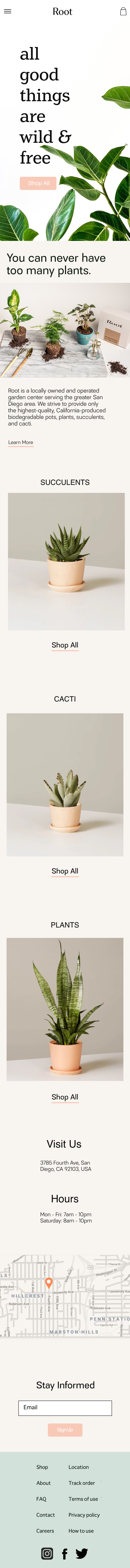 Root is a locally owned and operated garden center serving the greater San Diego area. Root strives to provide only the highest-quality, California-produced biodegradable pots, plants, succulents, and cacti.
